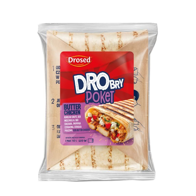 Tortilla pszenna z soczystym mięsem z kurczaka z papryką czerwoną. Dodane sery: intensywny w smaku cheddar i łagodna mozzarella, tworzą przyjemną w smaku warstwę serową. Całość dopełnia lekko pikantny sos z wyczuwalnym maślanym smakiem. DRObryPoket to sycące danie z nutą kuchni indyjskiej i streetfoodowego klimatu